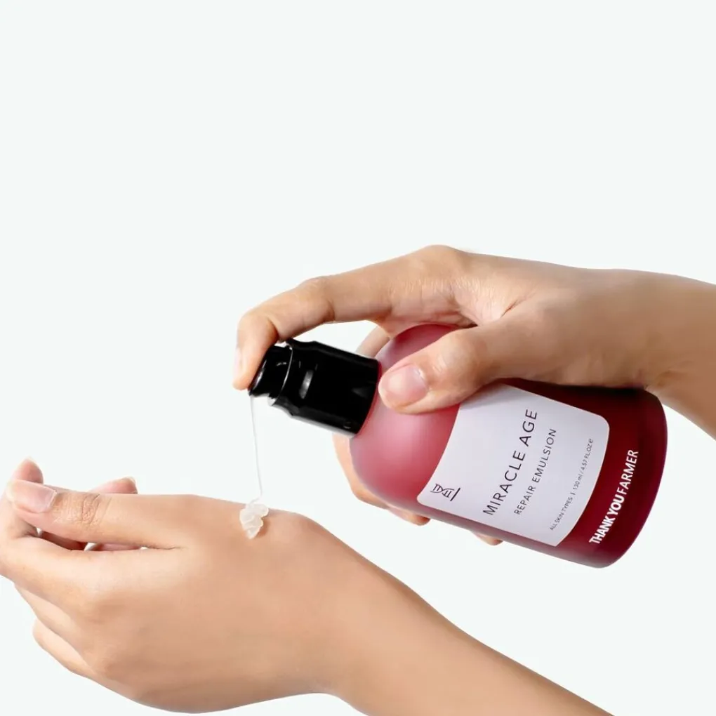 THANK YOU FARMER Miracle Age Repair Emulsion is een voedende en anti-aging moisturizer die de huidelasticiteit en stevigheid helpt verbeteren. Verrijkt met krachtige ingrediënten zoals propolisextract, peptiden en niacinamide, vermindert het de zichtbaarheid van fijne lijntjes en rimpels terwijl het de huid intens hydrateert. De lichte, niet-vette textuur trekt snel in en laat de huid zijdezacht, soepel en vernieuwd aanvoelen. Ideaal voor wie op zoek is naar een zachte maar effectieve oplossing voor een jeugdige en stralende huid.