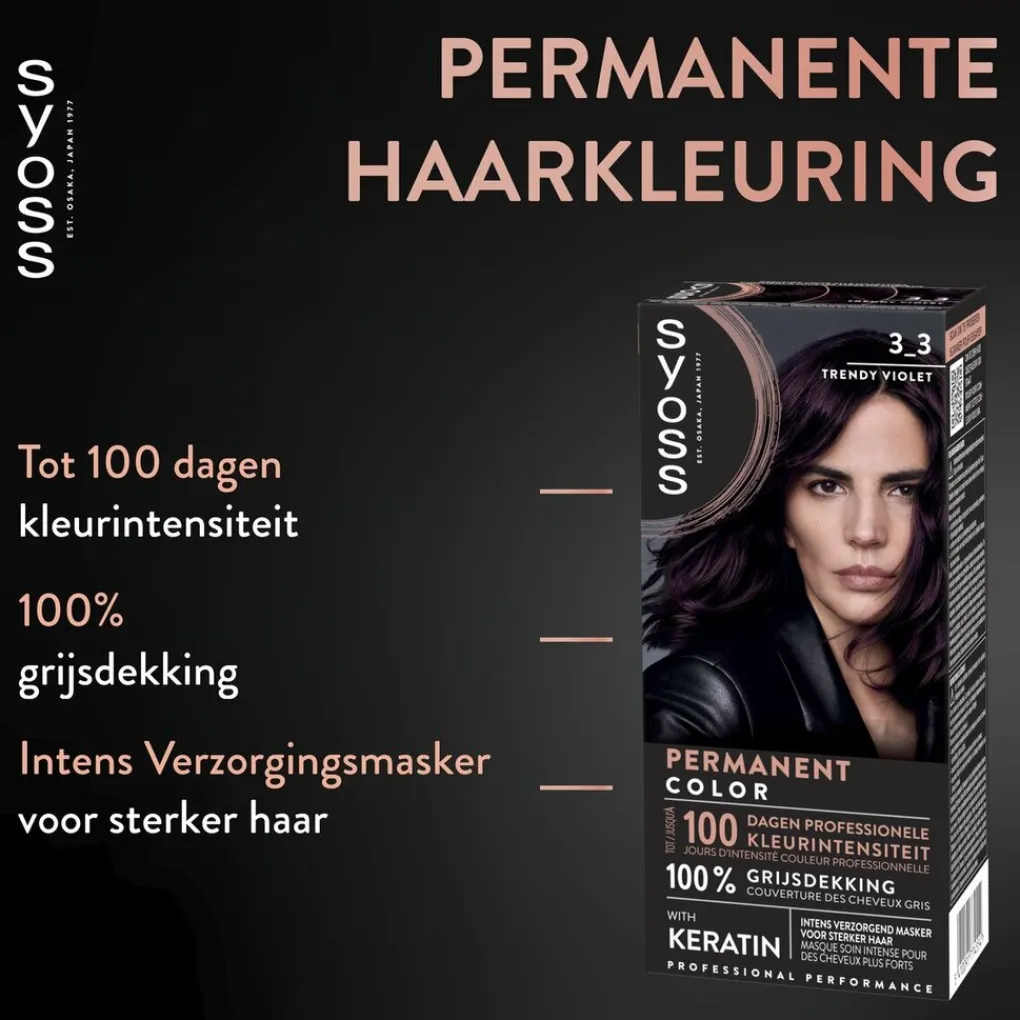 Syoss Professional Performance 3-3 Trendy Violet Permanente Haarkleuring is de haarkleuring met professionele grijsdekking en tot 80% minder haarbreuk*.