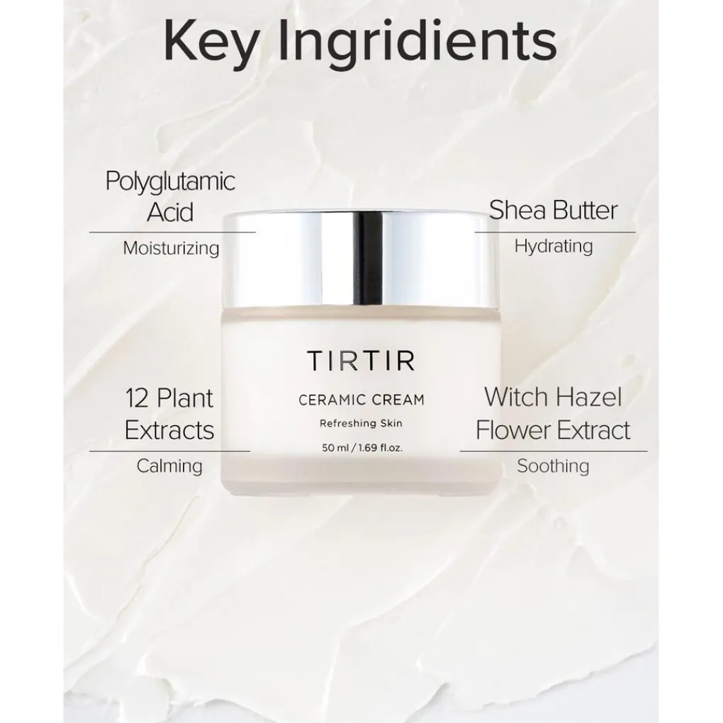 De TIRTIR Ceramic Cream is een intensief voedende gezichtscrème die de huid helpt te versterken, kalmeren en beschermen tegen uitdroging en externe invloeden. Dankzij een krachtige formule met ceramiden, hyaluronzuur en panthenol wordt de huidbarrière actief hersteld, terwijl de huid langdurig gehydrateerd en soepel blijft. De romige maar niet-vette textuur voelt comfortabel aan en is ideaal voor de droge tot gevoelige huid. Bij dagelijks gebruik zorgt deze crème voor een zachte, gebalanceerde en zichtbaar gezondere huid.