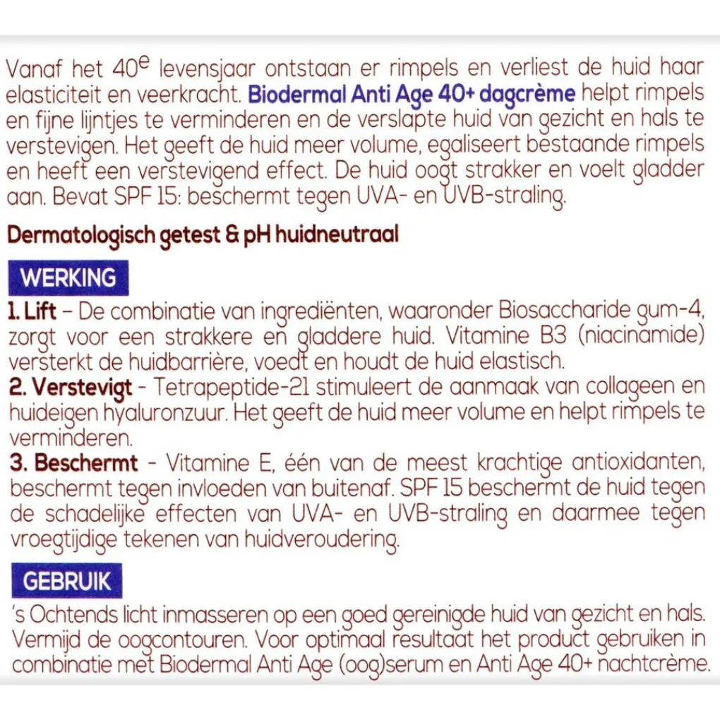 Met de jaren ontstaan er rimpels en verliest je huid aan elasticiteit. Biodermal Anti Age 40+ Dagcrème vermindert rimpels en verstevigt de verslapte huid van je gezicht en hals intensief.