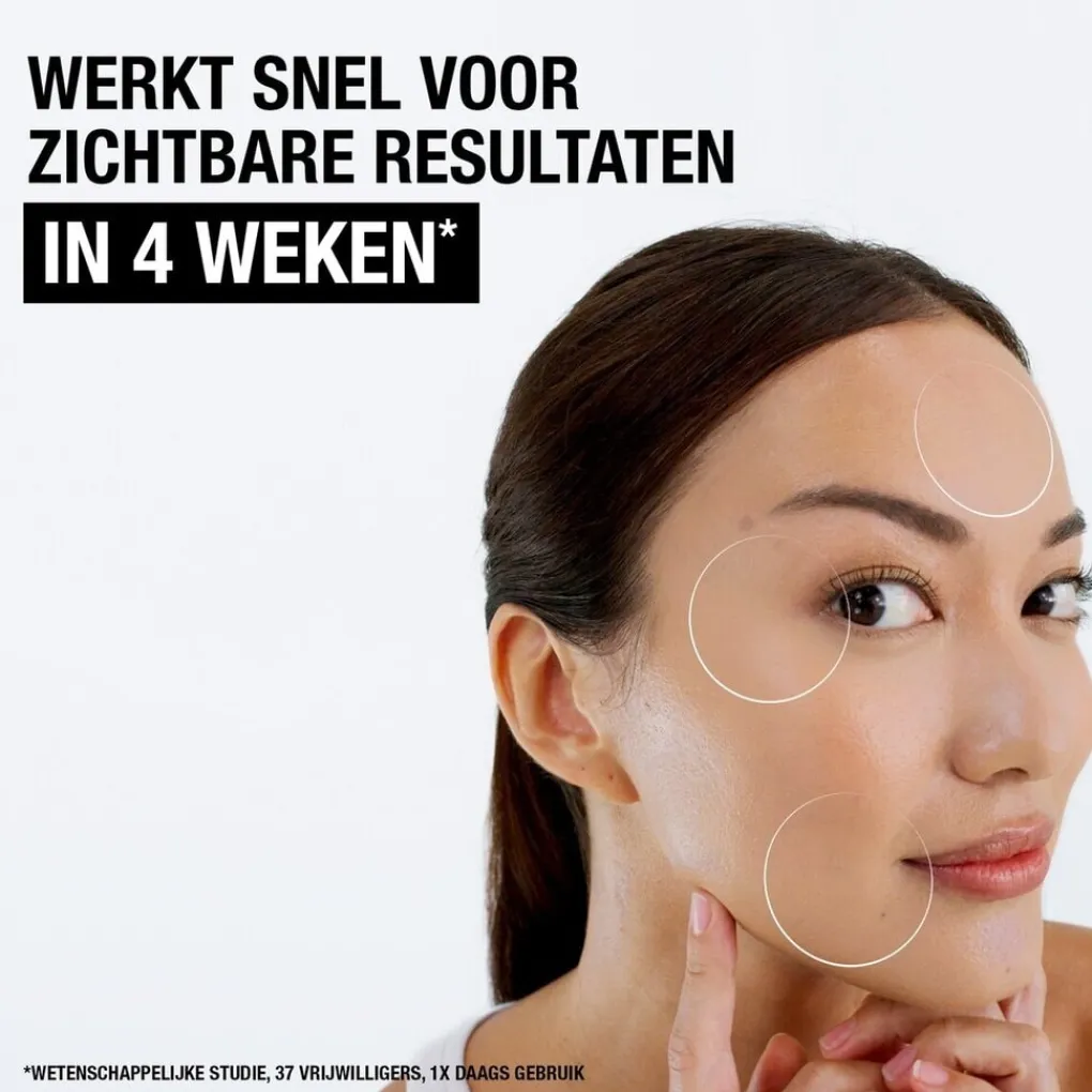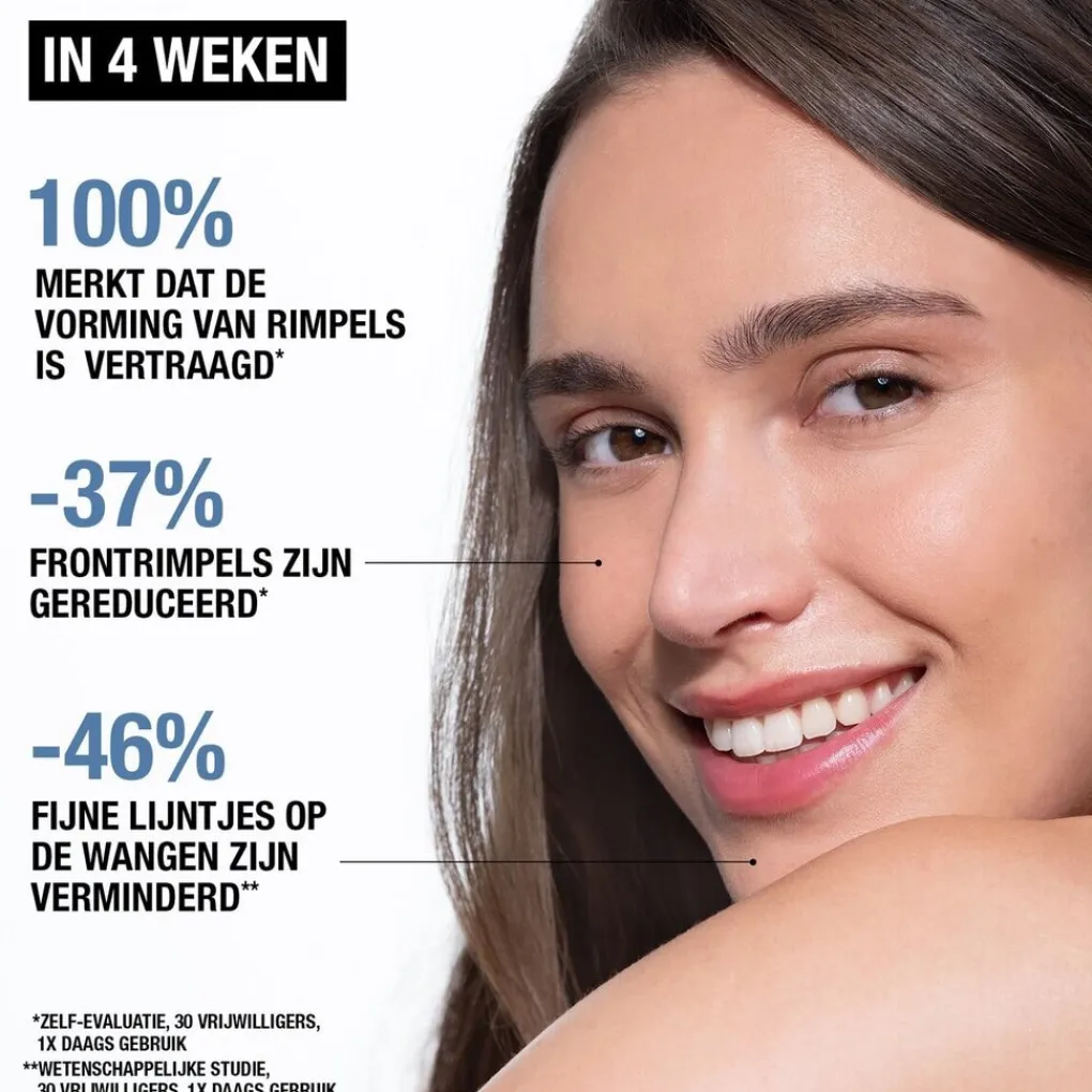 • Wetenschappelijk bewezen resultaten: na 1 week -46% fijne lijntjes en na 4 weken -37% fronsrimpels*