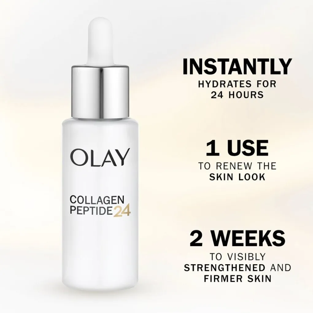 Ontdek het krachtige Olay Collagen Peptide24 Serum met een drievoudige werking: verstevigt, herstelt en hydrateert je huid.