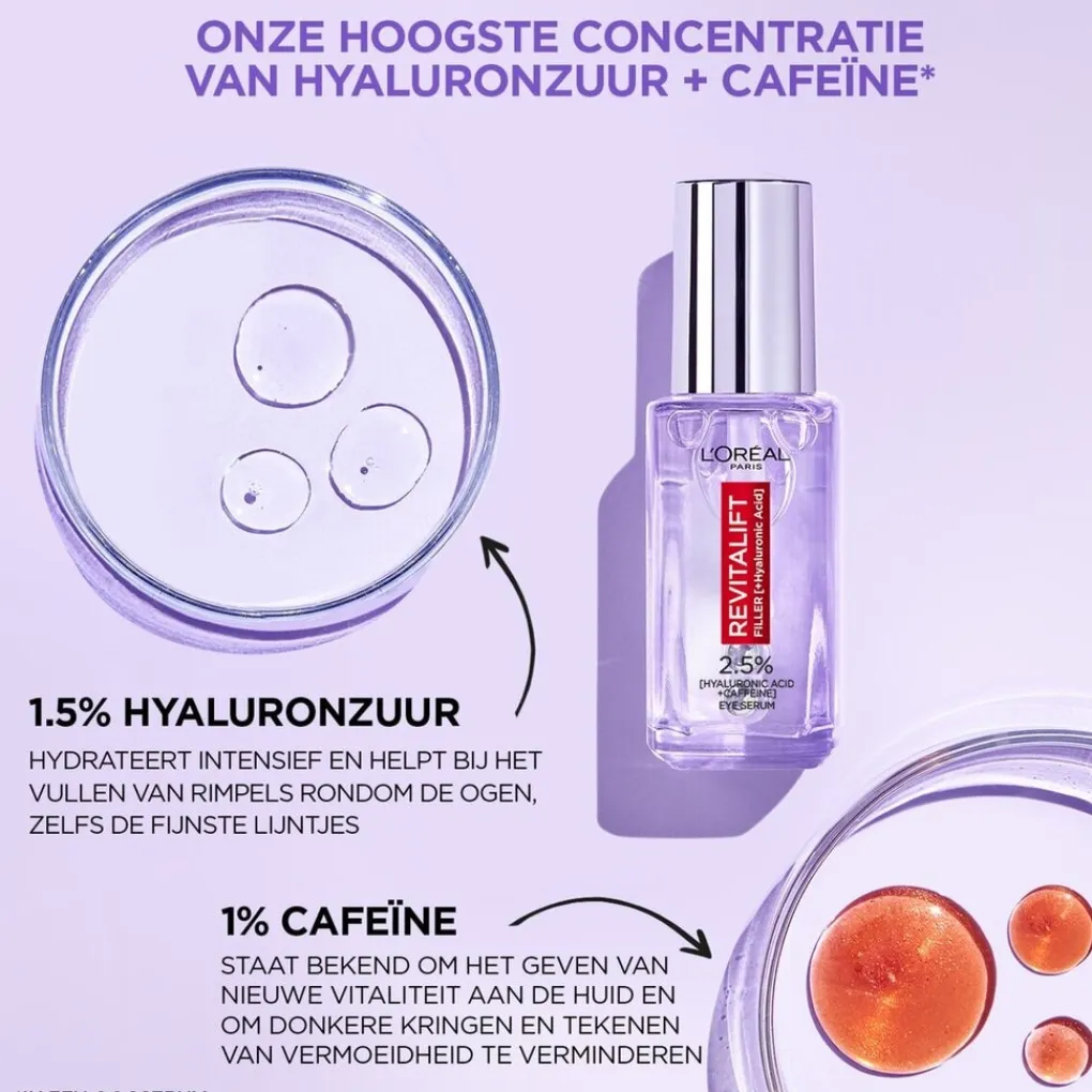 Het L’Oréal Paris Revitalift Filler Oogserum bevat hyaluronzuur en cafeïne en is daardoor zeer effectief bij het verminderen van rimpels, wallen en donkere kringen rondom je ogen. Het serum is geschikt voor alle huidtypes.
