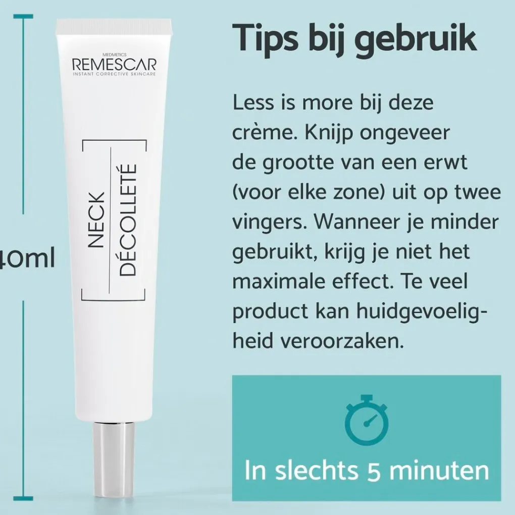 Remescar Hals & Decolleté Crème is speciaal geformuleerd om onmiddelijk je hals en decolleté te liften en strakker te maken in slechts vijf minuten.