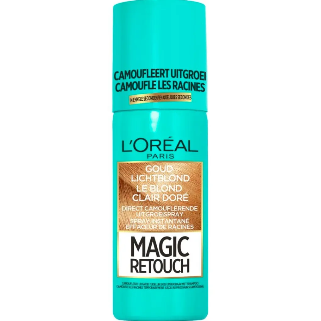 L’Oréal Paris Magic Retouch Goud Lichtblond Camouflerende Uitgroeispray is een uitwasbare spray die je uitgroei in drie seconden laat verdwijnen. De uitgroeispray camoufleert uitgroei tot de eerstvolgende wasbeurt met shampoo.