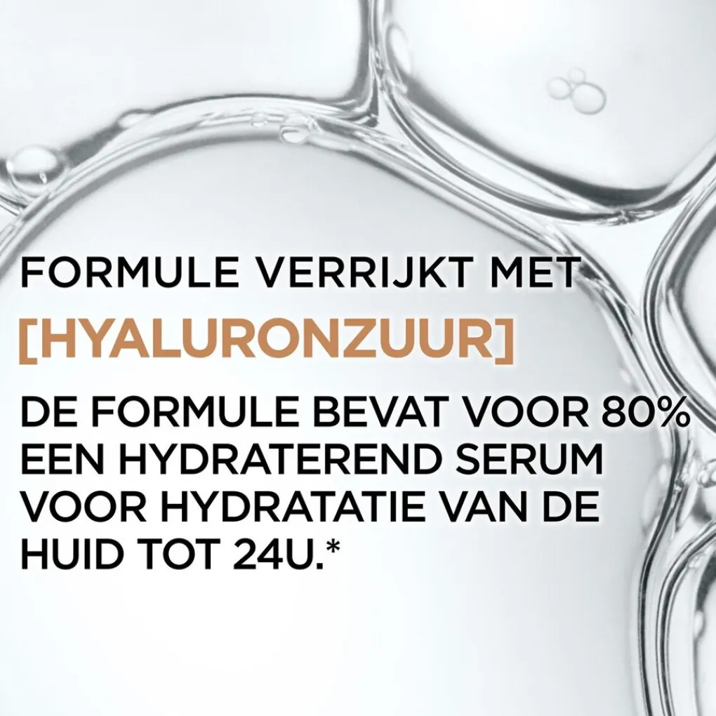 De formule bevat niet alleen hyaluronzuur maar ook glycerine. Hyaluronzuur trekt vocht aan en glycerine zorgt dat het beter door je huid wordt vastgehouden. Na vier weken gebruik ziet je huid er gladder uit en heeft ze minder droge plekjes.
