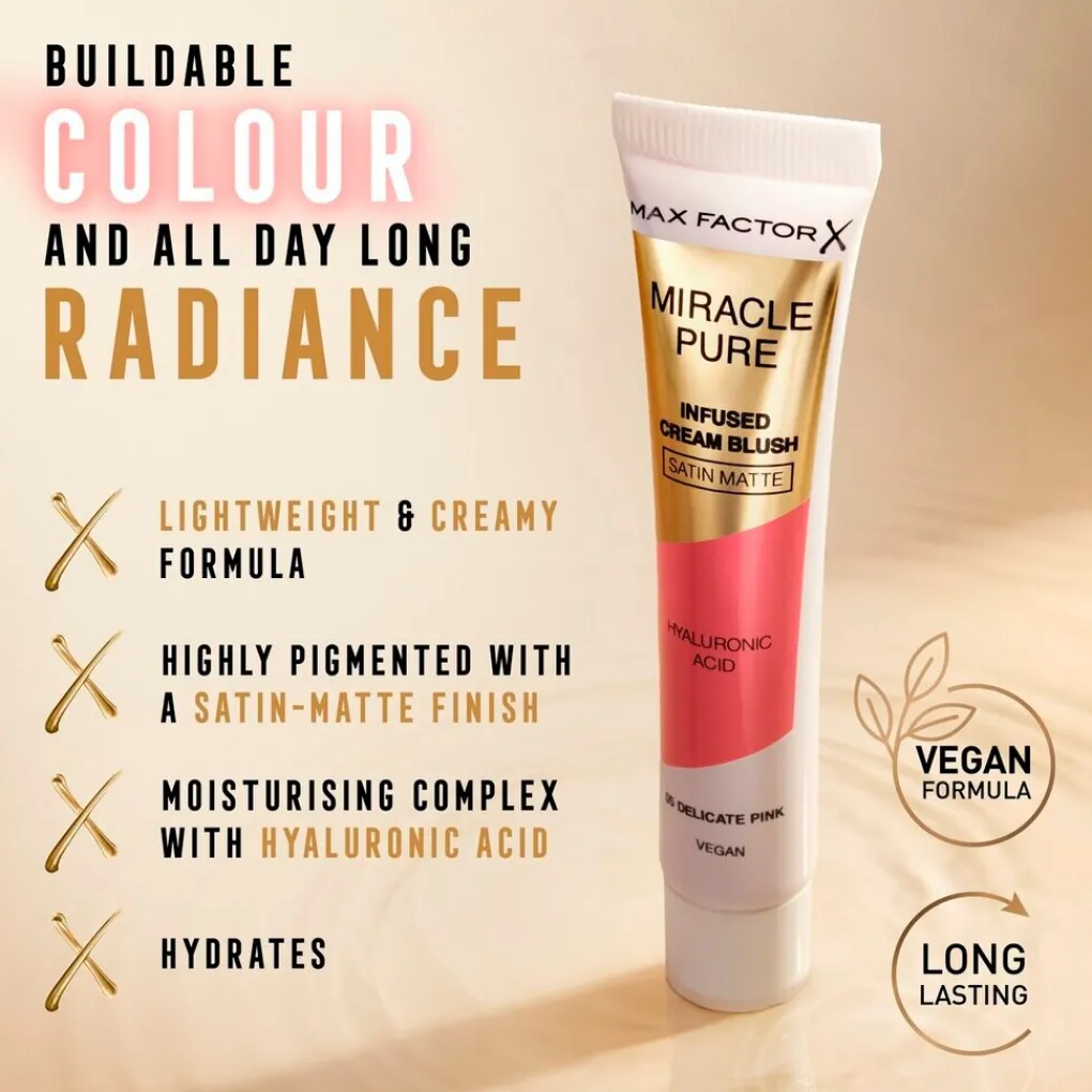 Voeg een vleugje kleur toe en geniet van een stralende look de hele dag door met de Max Factor Miracle Pure 05 Delicate Pink Infused Cream Blush.