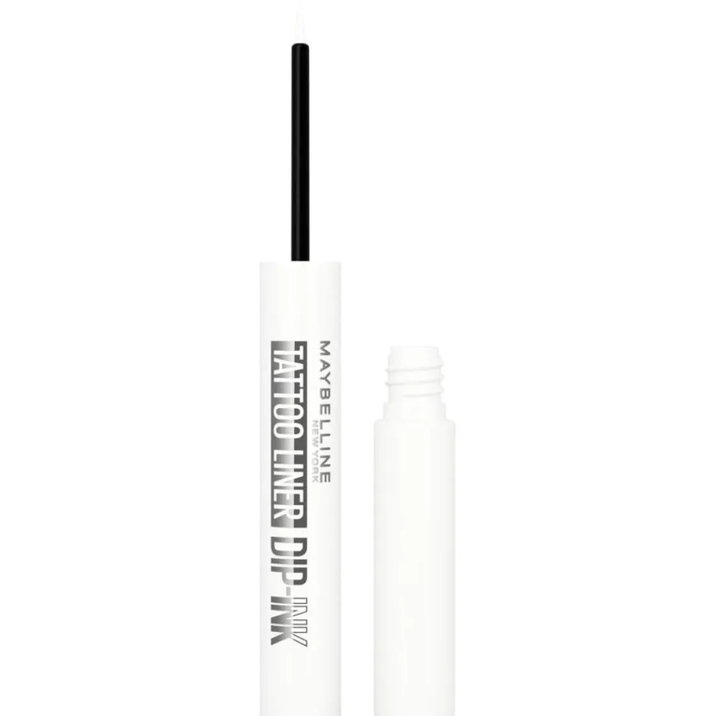 De high-impact Maybelline New York Tattoo Liner 104 White Canvas Dip-Ink Liquid Eyeliner is een langhoudende inkt die tot wel 24 uur lang intense, verzadigde kleur levert voor egedurfde, artistieke creaties.