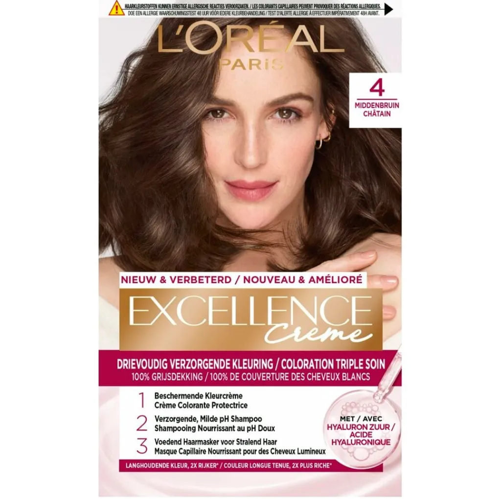 L’Oréal Paris Excellence Crème 4 Middenbruin Permanente Haarverf biedt drievoudige verzorging met een beschermende crèmekleuring, verzorgende shampoo en voedend haarmasker.