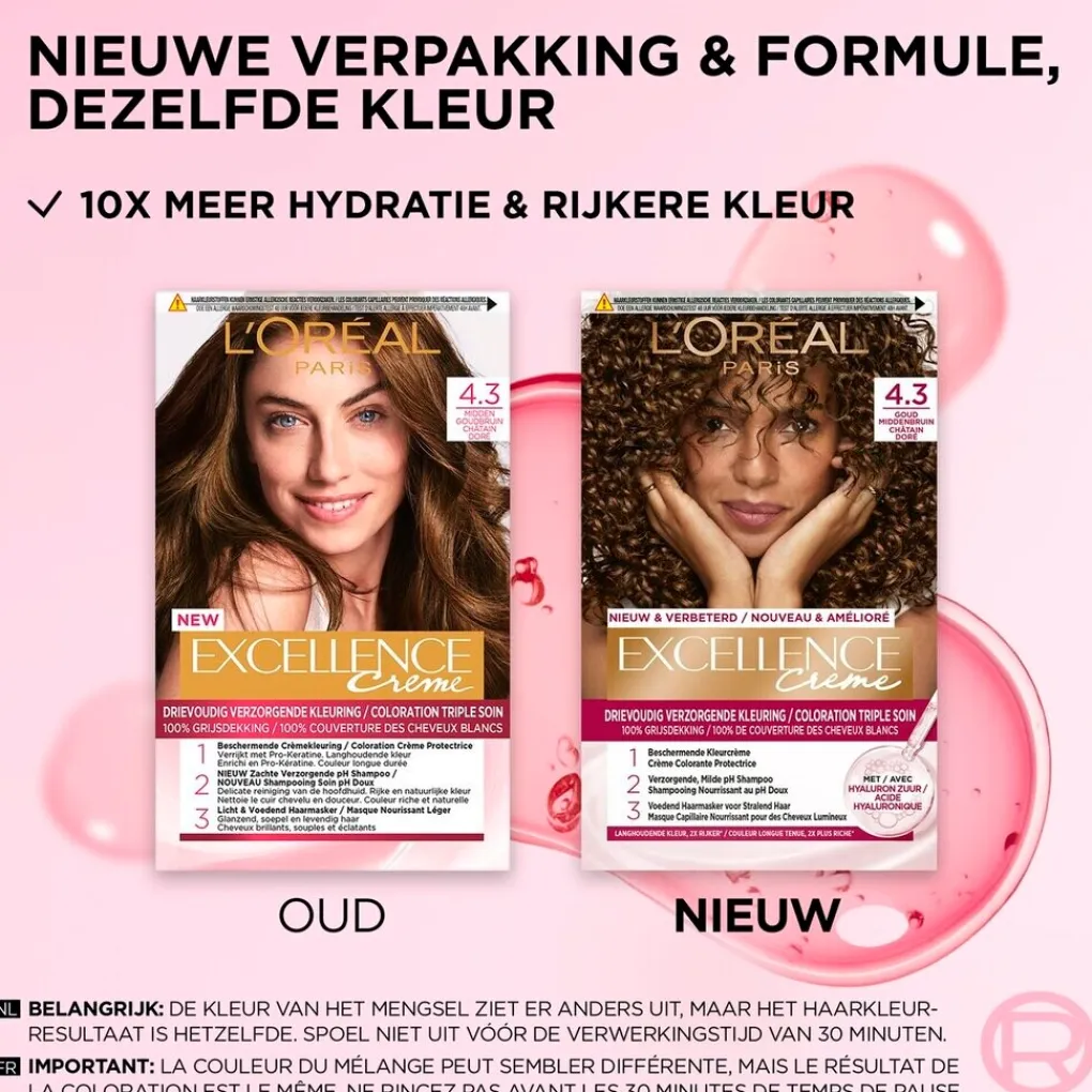 Met Excellence Crème 4.3 Midden Goudbruin kleur jij je haar eenvoudig zelf. De formule beschermt en verzorgt je haar, je hoofdhuid en je haarkleur. De kleuring biedt 100% grijsdekking en zorgt voor een rijke, levendige kleur die tot wel zes weken mooi blijft.