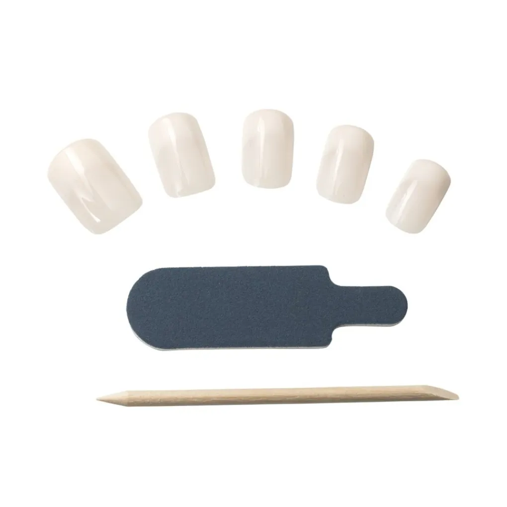 Sorteer de juiste formaat kunstnagel voor iedere natuurlijke nagel op volgorde. Houdt de roze nagellijm rechtop en draai de dop ervan af. Breng een dikke laag lijm aan op de achterkant van de kunstnagel. Leg de kunstnagel vervolgens tegen je nagelriem aan en druk deze stevig vast. Houdt de nagel vast totdat de lijm is opgedroogd. Gebruik een papieren doekje om de lijm die in aanraking met de huid komt te verwijderen voordat deze kan opdrogen.