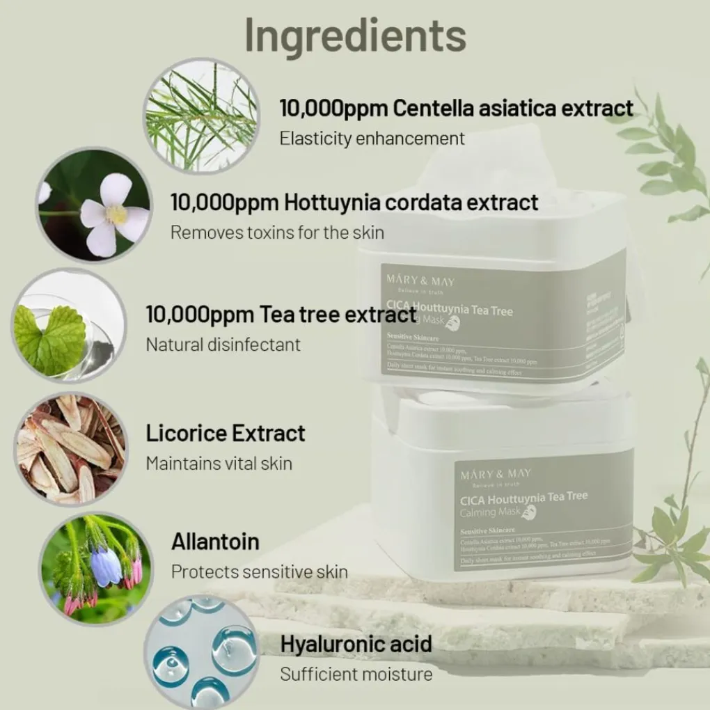 Mary & May Cica Eoseongcho Tea Tree Calming Mask Pack, met Centella asiatica-extract + Houttuynia cordata-extract + tea tree-extract, heeft uitstekende ontstekingsremmende en verzachtende effecten voor een snelle herstel en onmiddellijke werking. Dit is een dagelijks verzachtend verzorgingsmasker! Dit product biedt uitstekende verzorging en is perfect voor dagelijkse huidverzorgingsroutines. Het bevat natuurlijke ingrediënten die de huid voeden, hydrateren en kalmeren, wat het ideaal maakt voor verschillende huidtypes.
