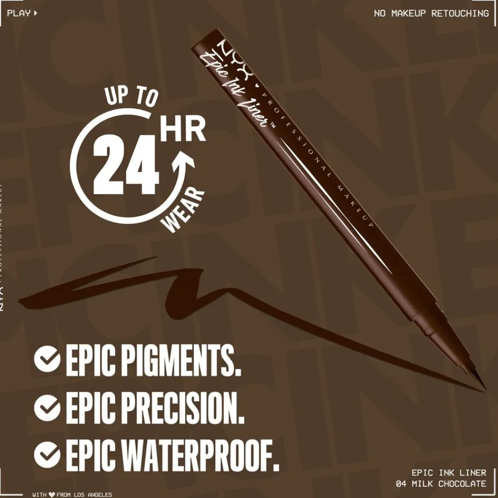Ontdek de ultieme precisie en langdurige prestaties met de NYX Professional Makeup Epic Ink 04 Milk Chocolate Eyeliner. Deze eyeliner is speciaal ontworpen voor een moeiteloze applicatie en langdurig resultaat tot wel 24 uur.