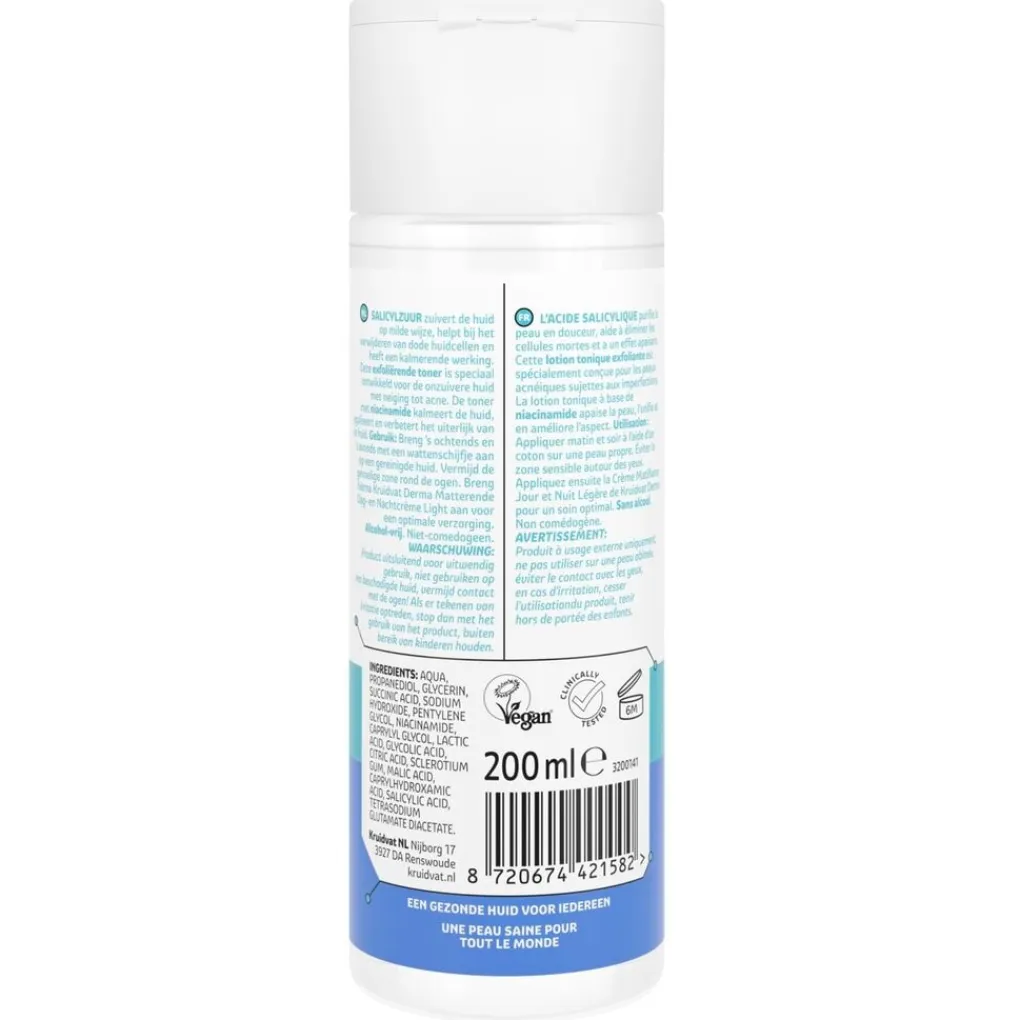 De Kruidvat Derma Exfoliërende Toner met niacinamide kalmeert je huid, egaliseert en verbetert het uiterlijk van je huid. Deze exfoliërende toner is speciaal ontwikkeld voor je onzuivere huid met neiging tot acne.