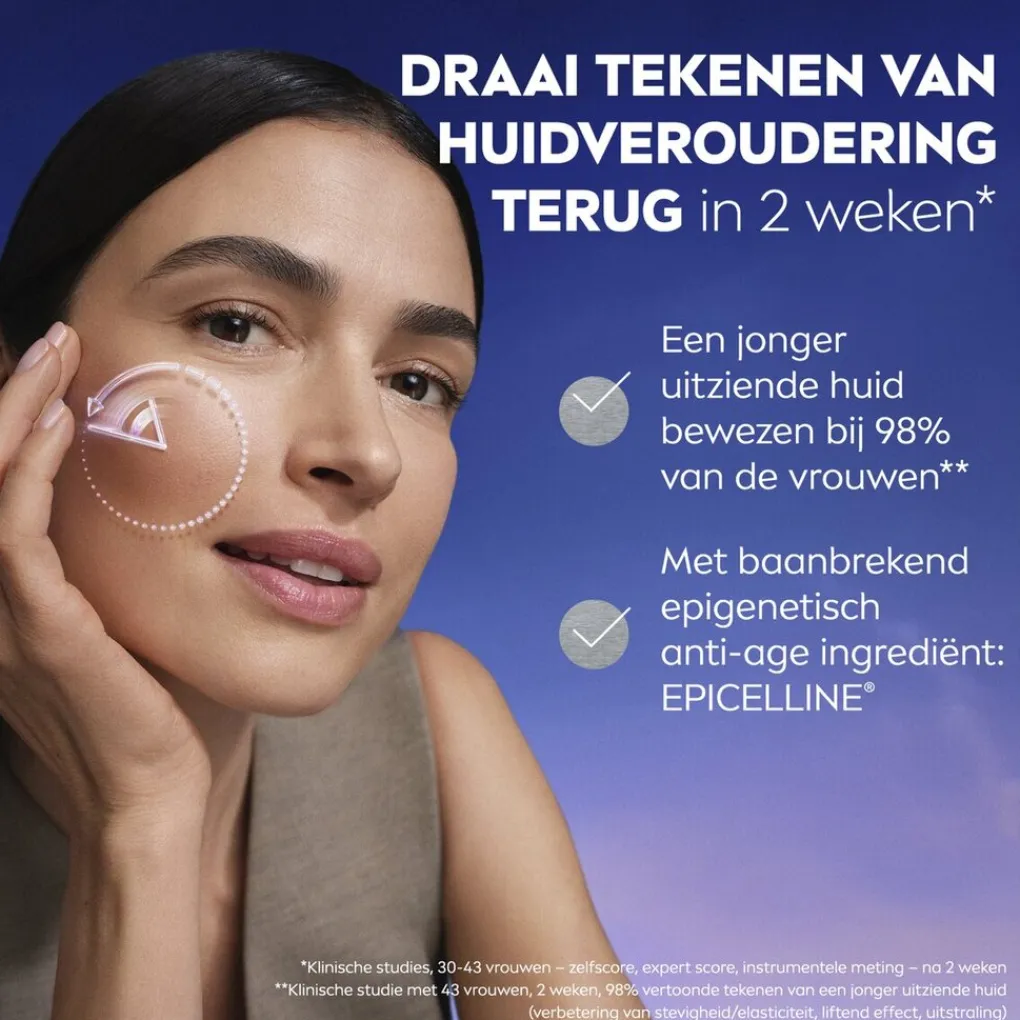 Het NIVEA Cellular Epigenetics Ultiem Huidverjongend Serum met epcelline vermindert tien tekenen van huidveroudering. Het zorgt voor een vollere, stralende huid vanaf 7 dagen. Het effect is klinisch bewezen.
