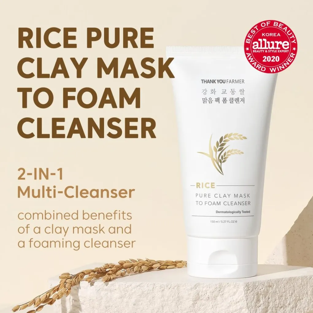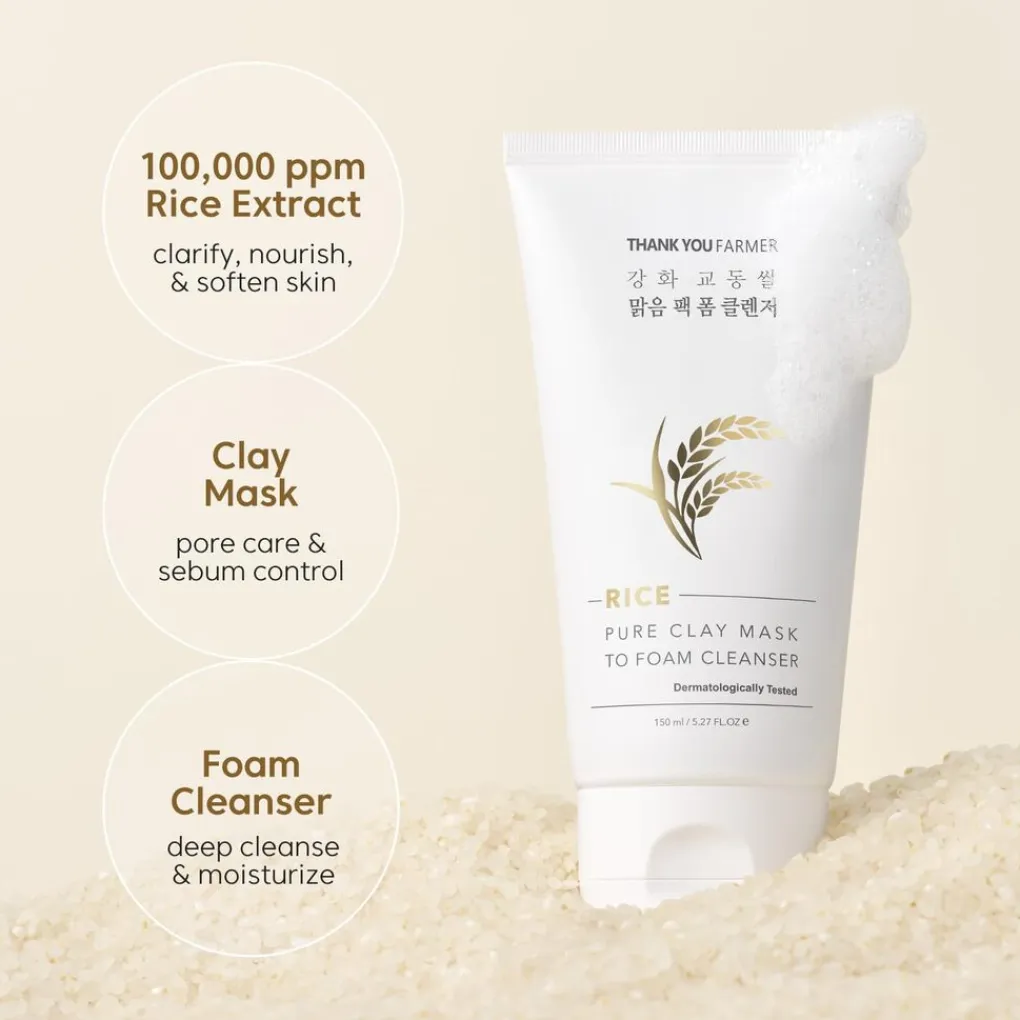 THANK YOU FARMER Rice Pure Clay Mask to Foam Cleanser is een multifunctionele 2-in-1 reiniger die werkt als zowel een diep reinigend kleimasker als een milde schuimende cleanser. De formule is verrijkt met rijstextract, kaolienklei en plantaardige oliën, die helpen bij het verwijderen van onzuiverheden, het verfijnen van poriën en het verbeteren van de huidtextuur. Bij contact met water verandert het masker in een zacht schuim dat de huid verfrist, zacht reinigt en een gezonde gloed achterlaat. Perfect voor wie op zoek is naar een efficiënte reiniging zonder de huid uit te drogen.