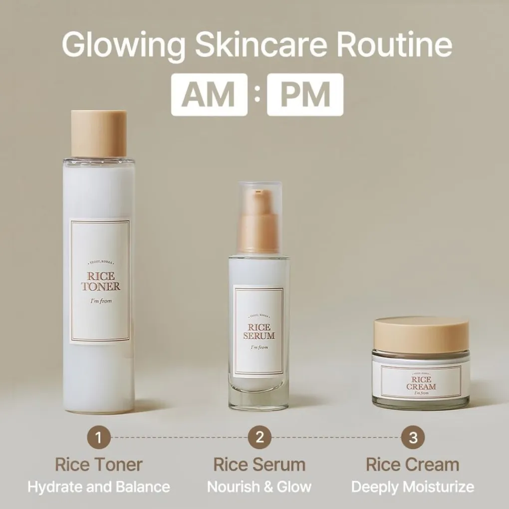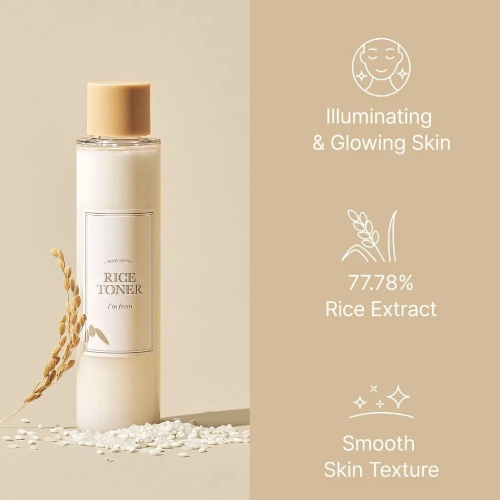 I’m from Rice Toner, een iconische, twee-fasen toner met 77,78% Yeoju rijstextract, ontworpen om de huid intens te voeden, te hydrateren en te verhelderen. Deze zachte maar krachtige toner verbetert de huidtextuur, vermindert pigmentatie en versterkt de huidbarrière. Door de toner te schudden meng je de voedende laag met hydraterende bestanddelen, wat zorgt voor een zachte, stralende en egale huid – ideaal voor de doffe of droge huid.