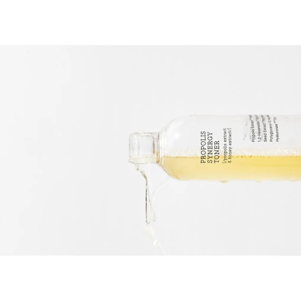 De Cosrx Propolis Synergy Toner bevat 72,6% extract van zwarte bijenpropolis en 10% honingextract. De toner maakt je huid glanzend en glad.