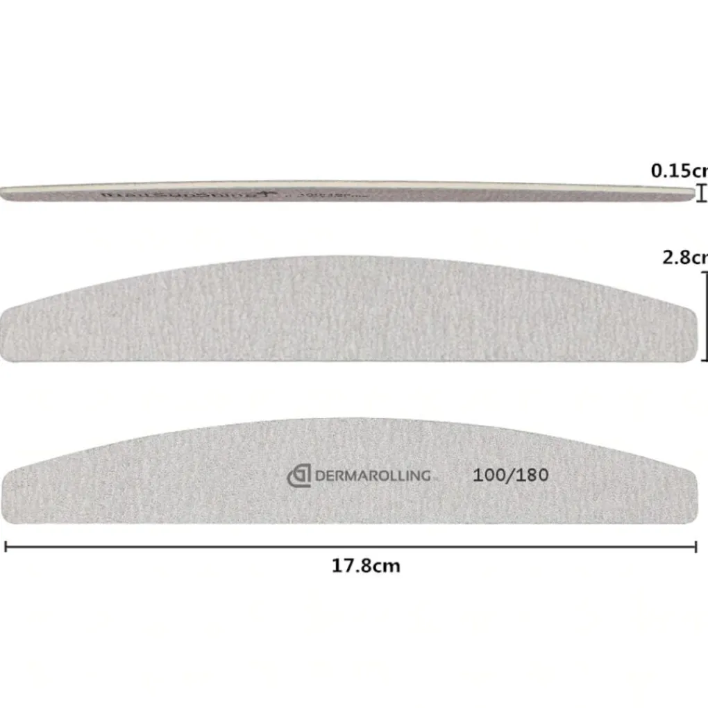 De Dermarolling Professionele Nagelvijl Halve Maan 100/180 is een must-have tool voor nagelstylisten en manicureliefhebbers. Deze hoogwaardige nagelvijl met dubbele grit biedt twee schuurgroottes in één vijl: grit 100 (grof) voor het inkorten van stevigere nagelverlengingen zoals acryl, en grit 180 (middel) voor het bijwerken van tips of het verfijnen van de vorm.