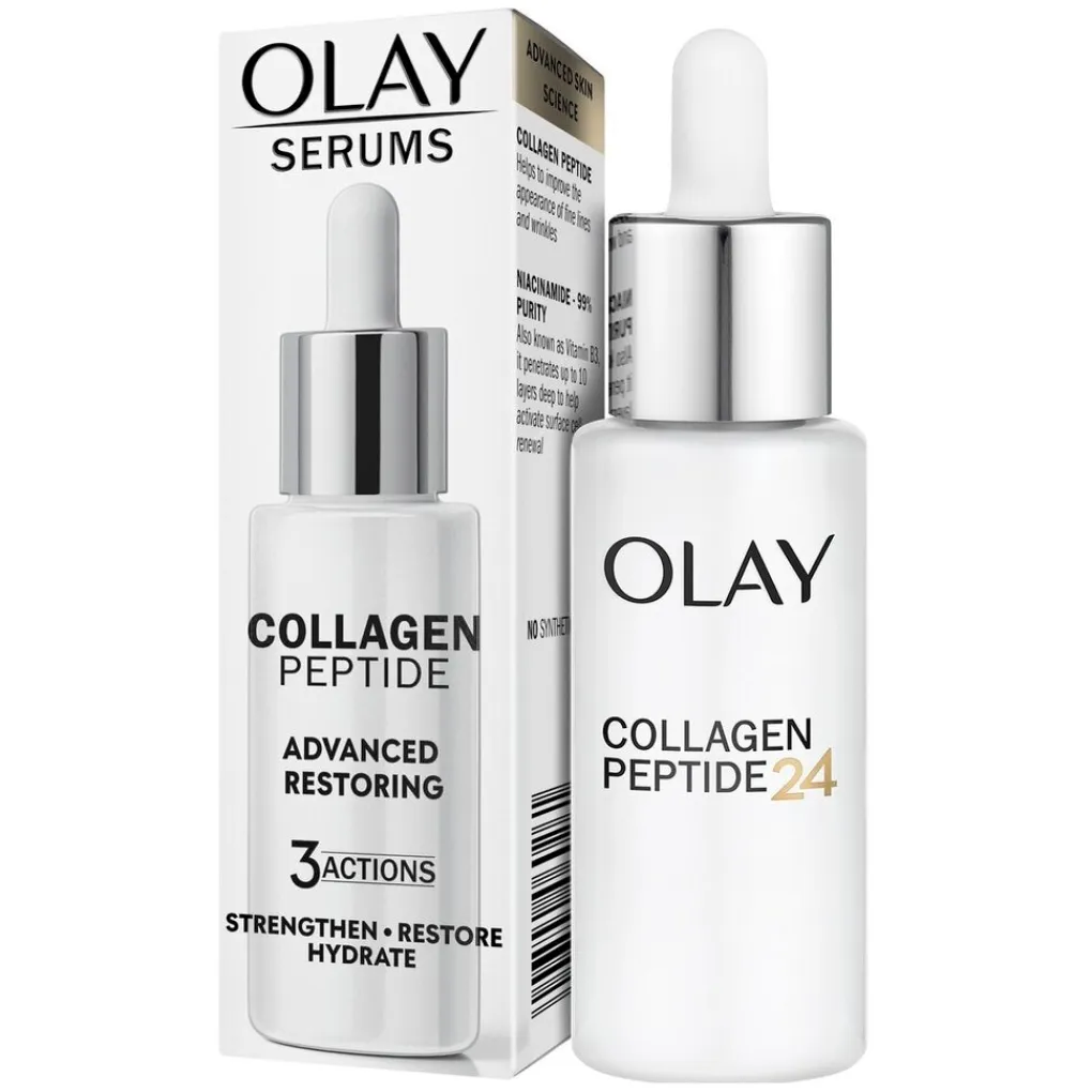 Ontdek het krachtige Olay Collagen Peptide24 Serum met een drievoudige werking: verstevigt, herstelt en hydrateert je huid.