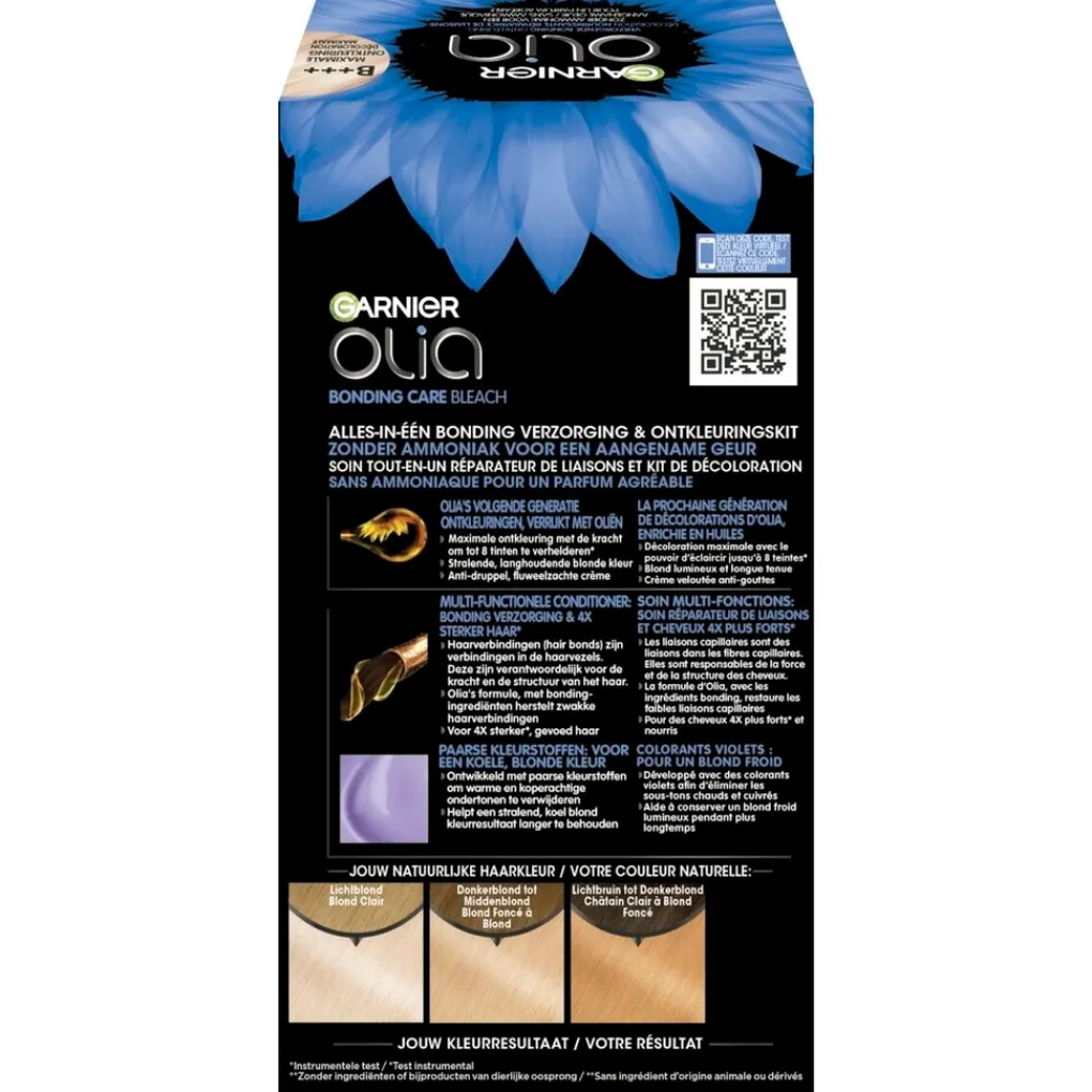 De Garnier Olia Bonding Care Bleach B+++ Maximale Ontkleuring bevat geen ammoniak voor een prettige geurervaring tijdens het kleuren.