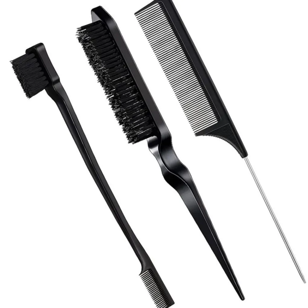 Deze set van TBC bevat 3 essentiële haarverzorgingsproducten: een dubbelzijdige randborstel, een borstel met varkensharen en een puntkam. VOORDELENDubbelzijdige randborstel: perfect voor het gladmaken van randen en weerbarstig haar. Deze borstel zorgt ervoor dat je haar er bij elke gelegenheid verzorgd en elegant uitziet. Je kunt de fijne borstel ook gebruiken voor je wimpers en wenkbrauwen.Borstel met varkenshaar: verdeelt haarwax gelijkmatig van de wortels tot de punten, waardoor je haar gladder en beter in model blijft.Puntkam: Ideaal voor het snel verdelen en scheiden van het haar. Werkt perfect in combinatie met een föhn voor professionele resultaten thuis.Belangrijkste kenmerken: Onmisbaar voor het stylen van pony’s, haarlijnen, randen, wenkbrauwen en wimpers en voor het maken van scherpe scheidingen. Voeg haarwax of gel toe voor nog mooiere kapsels.Compact en reisvriendelijk ontwerp: gemakkelijk mee te nemen voor onderweg. Deze set neemt minimale ruimte in beslag in uw handtas of rugzak, waardoor hij perfect is voor reizen of zakenreizen.De verpakking bevat 3 sets1 puntkam1 kantborstel1 teasingborstel