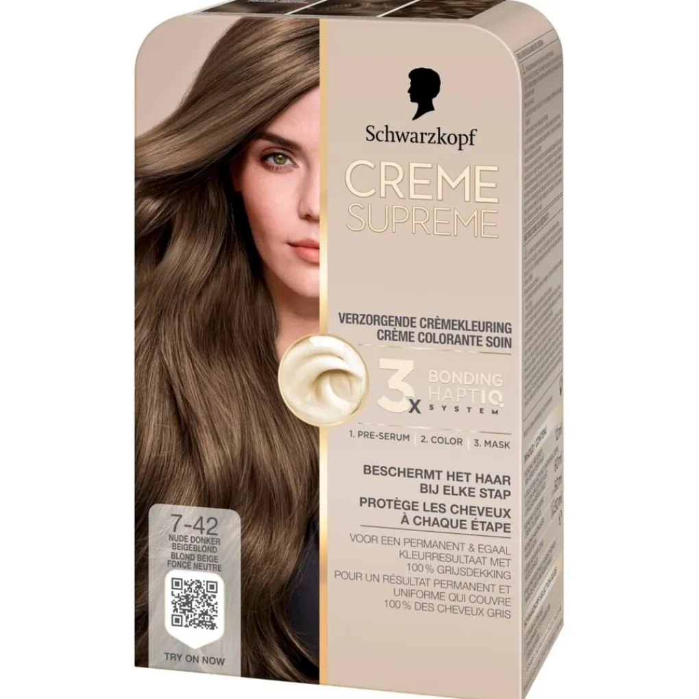 De Schwarzkopf Creme Supreme 7-42 Nude Donker Beigeblond Verzorgende Crèmekleuring geeft de kleur die je wilt met de verzorging die je verdient.