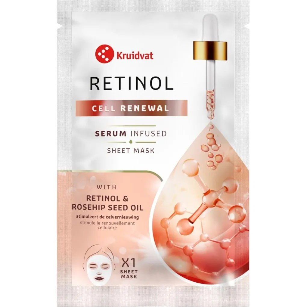 Het Kruidvat Cell Renewal Retinol & Rosehip Seed Oil Sheet Mask is doordrenkt met een intensief voedend serum verrijkt met retinol en rozenbottelolie die de zichtbaarheid van fijne lijntjes en rimpels verzacht.