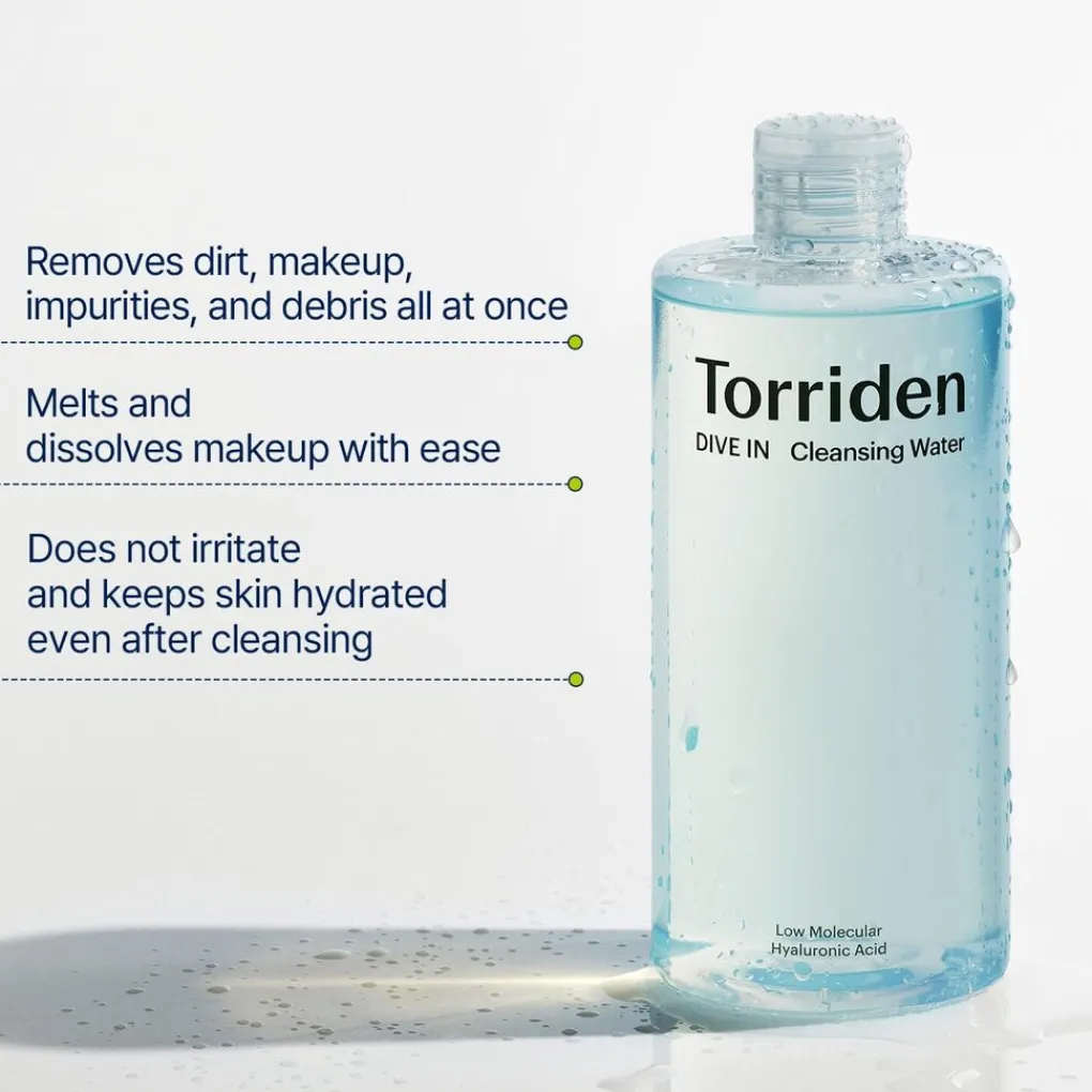 Torriden DIVE-IN Low Molecular Hyaluronic Acid Cleansing Water is een zachte maar effectieve reiniger die je huid diep reinigt terwijl het tegelijkertijd hydrateert. Geformuleerd met laagmoleculair hyaluronzuur, dringt dit reinigingswater diep door in de huidlagen om langdurige hydratatie te bieden, terwijl het vuil, olie en make-up moeiteloos verwijdert. De milde formule is ideaal voor alle huidtypes, inclusief de gevoelige huid, en zorgt ervoor dat de huid niet uitdroogt of geïrriteerd raakt. Verrijkt met panthenol, kalmeert het de huid en helpt het bij het behouden van de vochtbalans, waardoor de huid zacht, soepel en fris aanvoelt na elke reiniging.