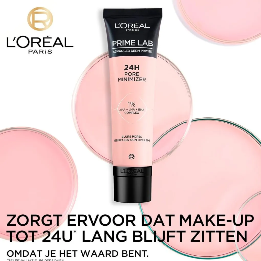 Met de L’Oréal Paris Prime Lab 24H Pore Minimizer heb je het voordeel van extra langhoudende make-up plus extra voordelen voor je huid op de lange termijn. De formule is verrijkt met 1% AHA + LHA + BHA-complex, waarvan het is bewezen dat het zichtbare poriën vermidert en je huid gladder maakt. De zijdachtige textuur voelt comfortabel aan op je huid. De primer laat je poriën kleiner lijken zodat je make-up er de hele dag egaal uit ziet.