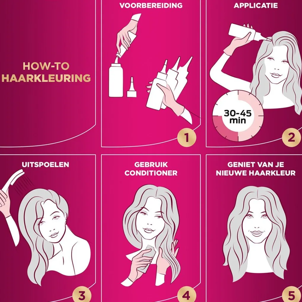 Bereid het mengsel voor zoals aangegeven in de gebruiksaanwijzing en breng aan op droog haar. Laat 30 minuten inwerken en spoel dan grondig uit. Breng daarna de conditioner aan en laat deze 2 minuten uitwerken. Spoel je haar daarna grondig uit.