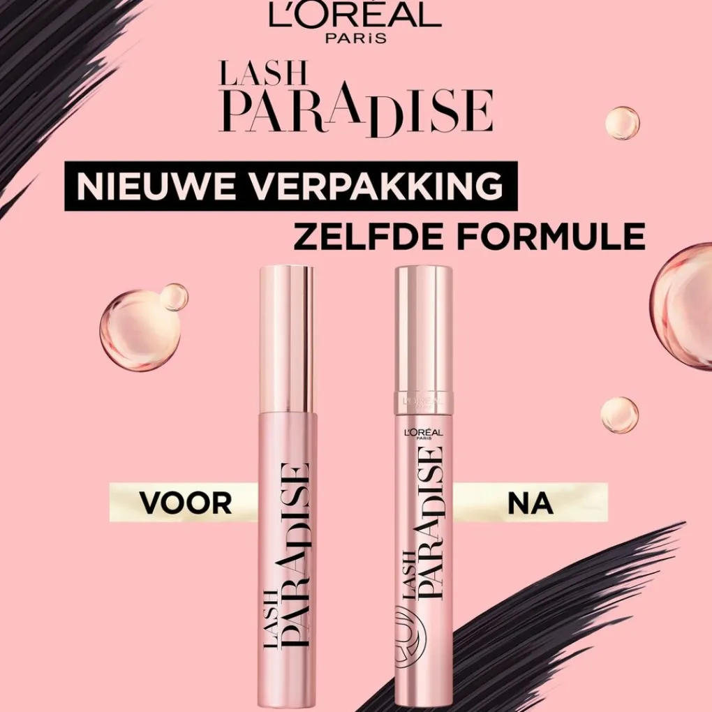L’Oréal Paris Lash Paradise 01 Black Volume Mascara geeft volume aan je wimpers, zonder klontjes. De mascara vormt een laagje over je wimpers die ervoor zorgt dat je wimpers soepel blijven aanvoelen.