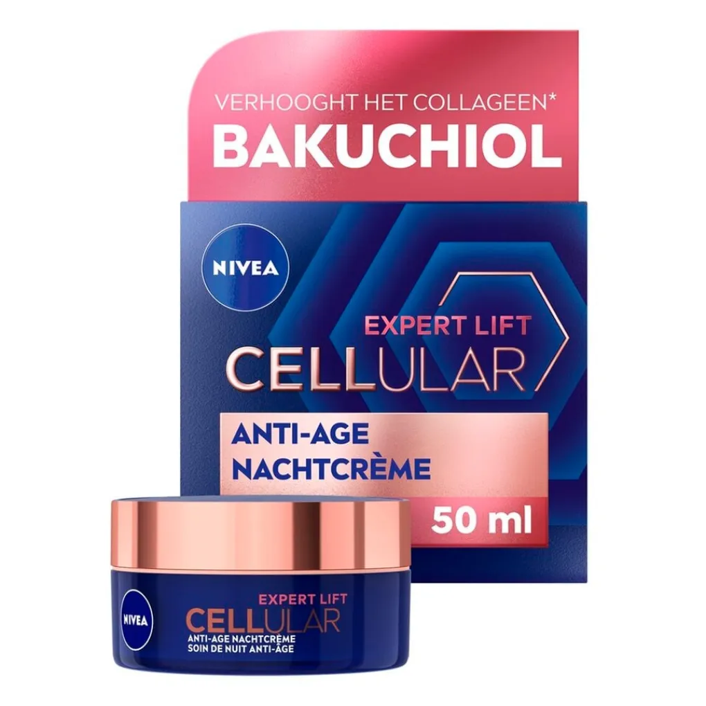 NIVEA Cellular Expert Lift Anti-Age Nachtcrème bevat bakuchiol, een plantaardig ingrediënt vergelijkbaar met retinol, dat de productie van collageen stimuleert voor een gladdere en stevigere huid. Het beschermt tegen vrije radicalen en is geschikt voor alle huidtypen, inclusief de gevoelige huid. Daarnaast bevat de crème macro en micro hyaluronzuur, die diepe hydratatie bieden en rimpels verminderen door tot 1000 keer hun gewicht in water vast te houden. Hierdoor worden rimpels van binnenuit verminderd.