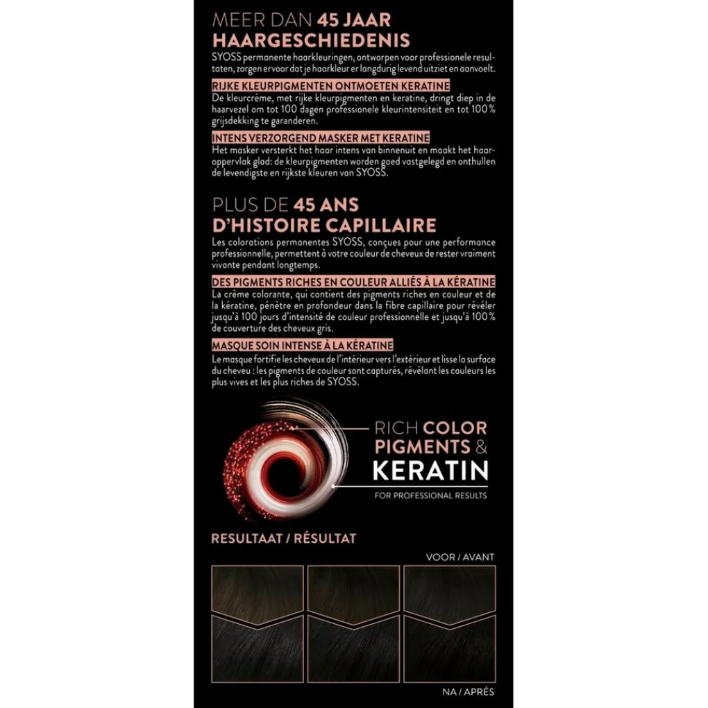 SYOSS permanente haarkleuringen, ontworpen voor professionele resultaten, zorgen ervoor dat je haarkleur er langdurig levend uitziet en aanvoelt. De kleurcrème, met rijke kleurpigmenten en keratine, dringt diep in de haarvezel om tot 100 dagen professionele kleurintensiteit en tot 100 % grijsdekking te garanderen. Het intens verzorgend masker met keratine versterkt het haar intens van binnenuit en maakt het haaroppervlak glad: de kleurpigmenten worden goed vastgelegd en onthullen de levendigste en rijkste kleuren van SYOSS.