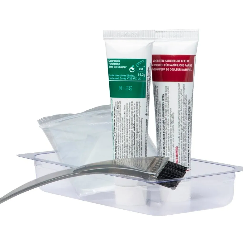 Kleurbasis 14 g, Kleurontwikkelaar 14 g, Plastic handschoenen, Simpele stap-voor-stap instructies