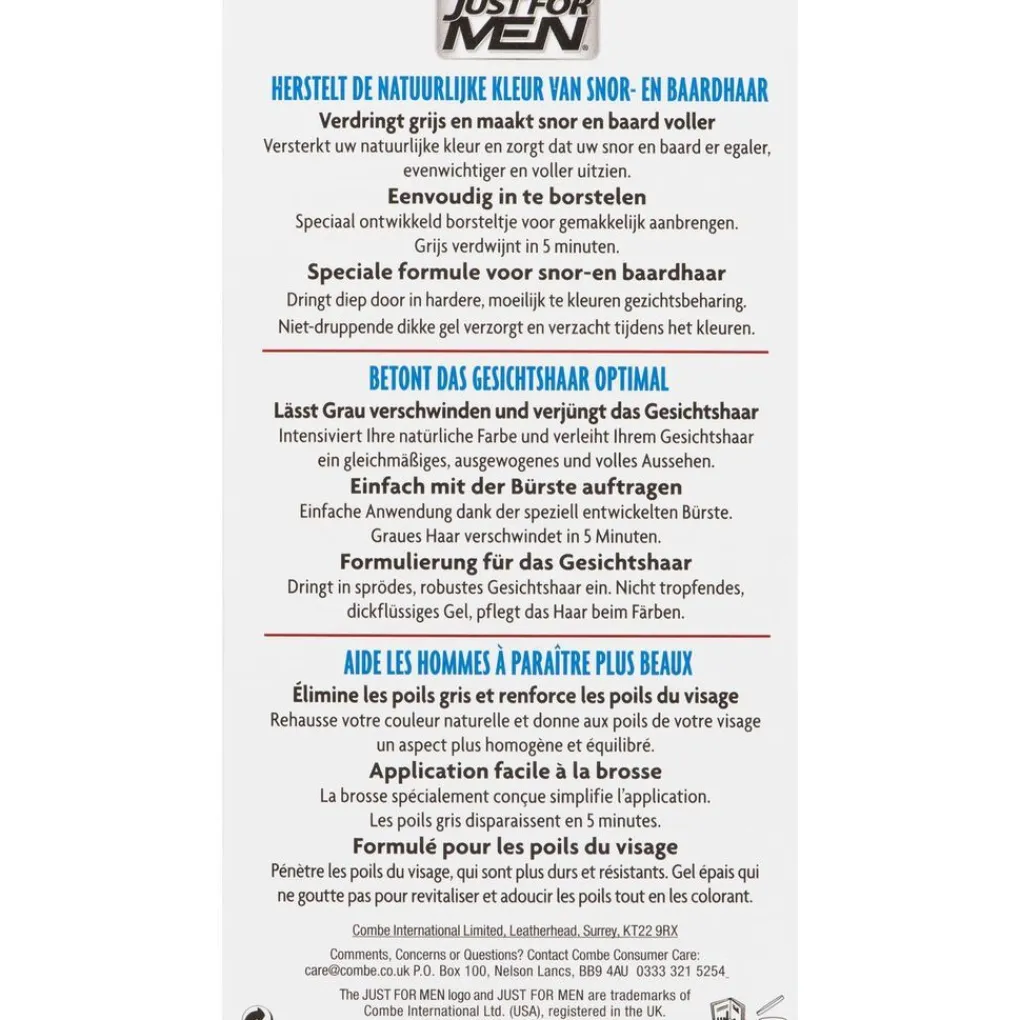Just For Men Snor & Baard M-35 Middenbruin Haarkleuring laat grijs binnen vijf minuten verdwijnen. De speciale formule voor snor- en baardharen dringt diep door in harde, moeilijk te kleuren gezichtsbeharing. Voor je beste baard ooit.