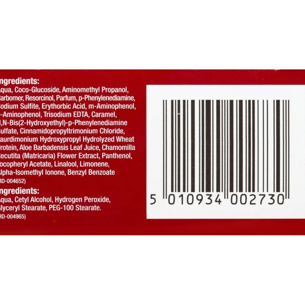 Ingrediënten: COLOUR BASE: Aqua, Aminomethyl Propanol, Carbomer, Resorcinol, Cetearyl Alcohol, Parfum, p-Phenylenediamine, Sodium Sulfite, Erythorbic Acid, Caramel, Biotin, m-Aminophenol, Coco-Glucoside, Colloidal Oatmeal, Aloe Barbadensis Leaf Extract, p-Aminophenol, N,N-Bis(2-Hydroxyethyl)-p-Phenylenediamine Sulfate, Cetearyl Glucoside, Cocos Nucifera (Coconut) Oil, Dicetyl Phosphate, Ceteth-10 Phosphate, Etidronic Acid, Maltodextrin. COLOUR DEVELOPER: Aqua, Cetyl Alcohol, Hydrogen Peroxide, Glyceryl Stearate, PEG-100 Stearate, Steareth-2, Laureth-23, Aloe Barbadensis Leaf Extract, Colloidal Oatmeal, Etidronic Acid, Maltodextrin.