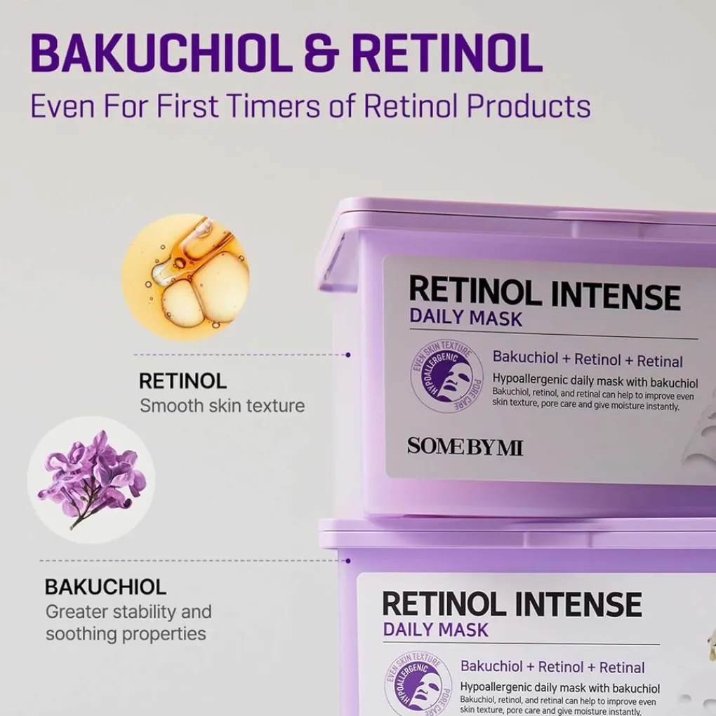 De SOME BY MI Retinol Intense Daily Mask is een set van 30 veganistische sheetmaskers voor dagelijks gebruik, verrijkt met retinol, retinal en bakuchiol om de huidelasticiteit te verbeteren, fijne lijntjes te verzachten en de huidtextuur te verfijnen. Dankzij acht soorten hyaluronzuur, niacinamide en ananasextract biedt het masker diepe hydratatie en een milde exfoliatie voor een stralende teint. De hypoallergene, biologisch afbreekbare maskers sluiten goed aan op de huid en zorgen voor optimale opname zonder irritatie. Geschikt voor alle huidtypes, inclusief de gevoelige huid, heeft het masker een niet-plakkerige, snel absorberende formule die de huid zichtbaar revitaliseert en voller doet aanvoelen. Voor het beste resultaat aanbrengen op gereinigde, getonifieerde huid, 10–20 minuten laten inwerken en de resterende essence zachtjes inmasseren.