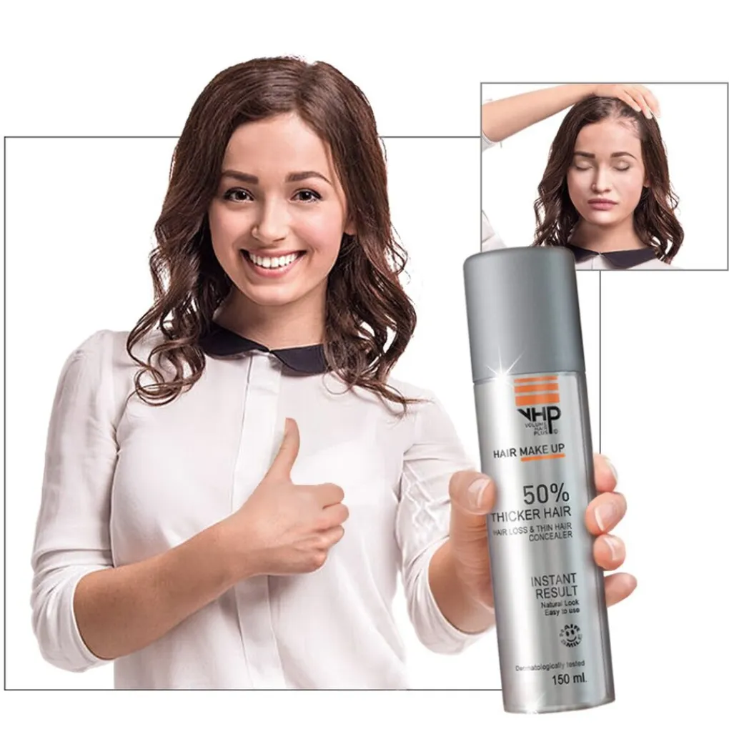 Camoufleer dunbehaarde en kalende plekken op natuurlijke wijze met Volume Hair Plus Donker Bruin Verdikkende Hairspray. De spray is ook ideaal bij uitgroei van geverfd haar of het camoufleren van grijze haren.
