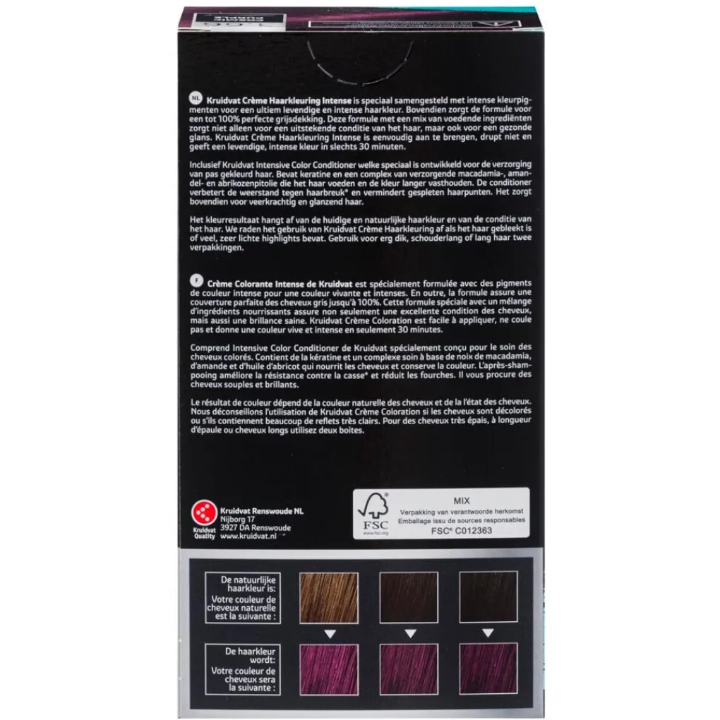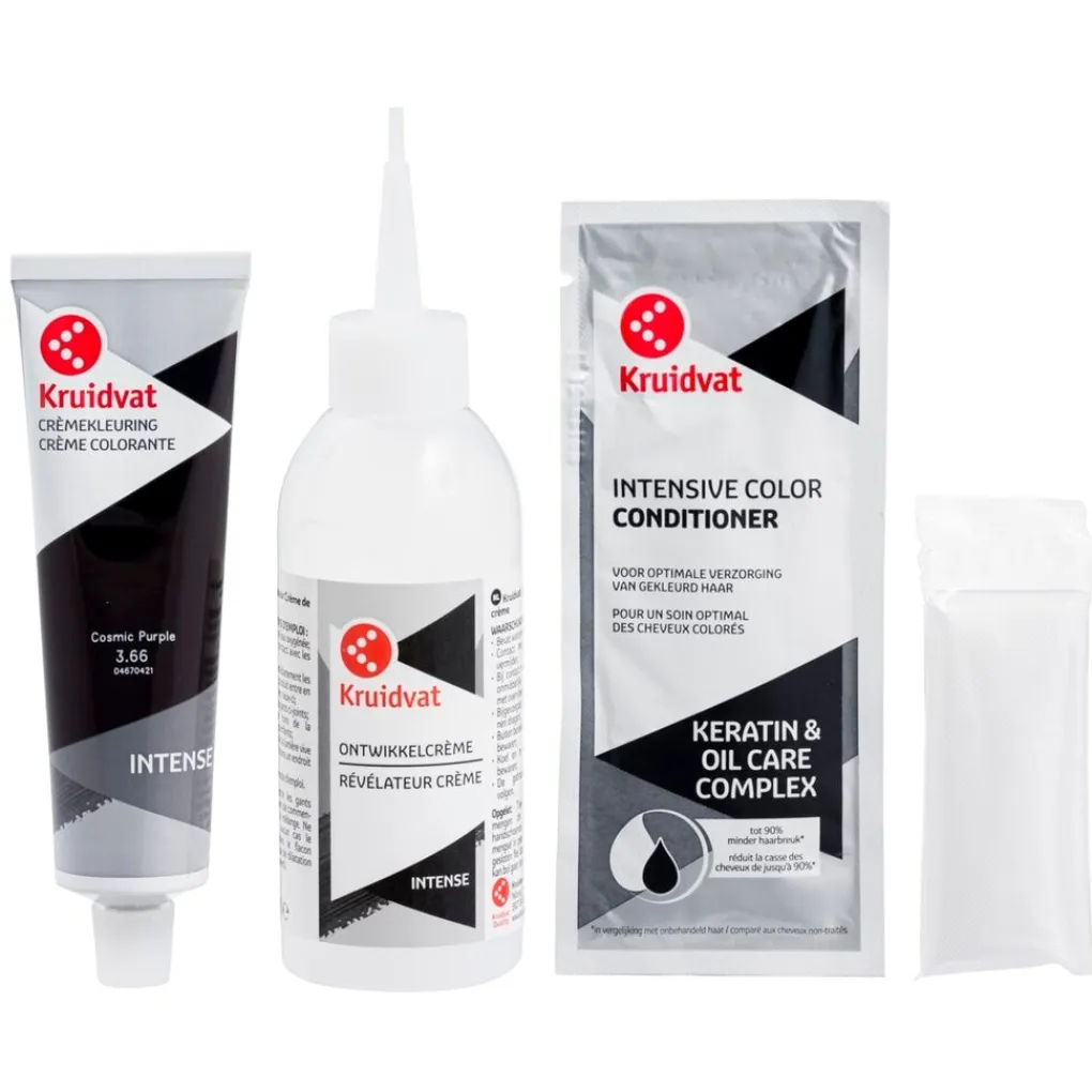 Geef je haar een levendige, intense kleur, een perfecte grijsdekking en een langdurige glans met deze Kruidvat Intense 3.66 Cosmic Purple Crème Haarkleuring.