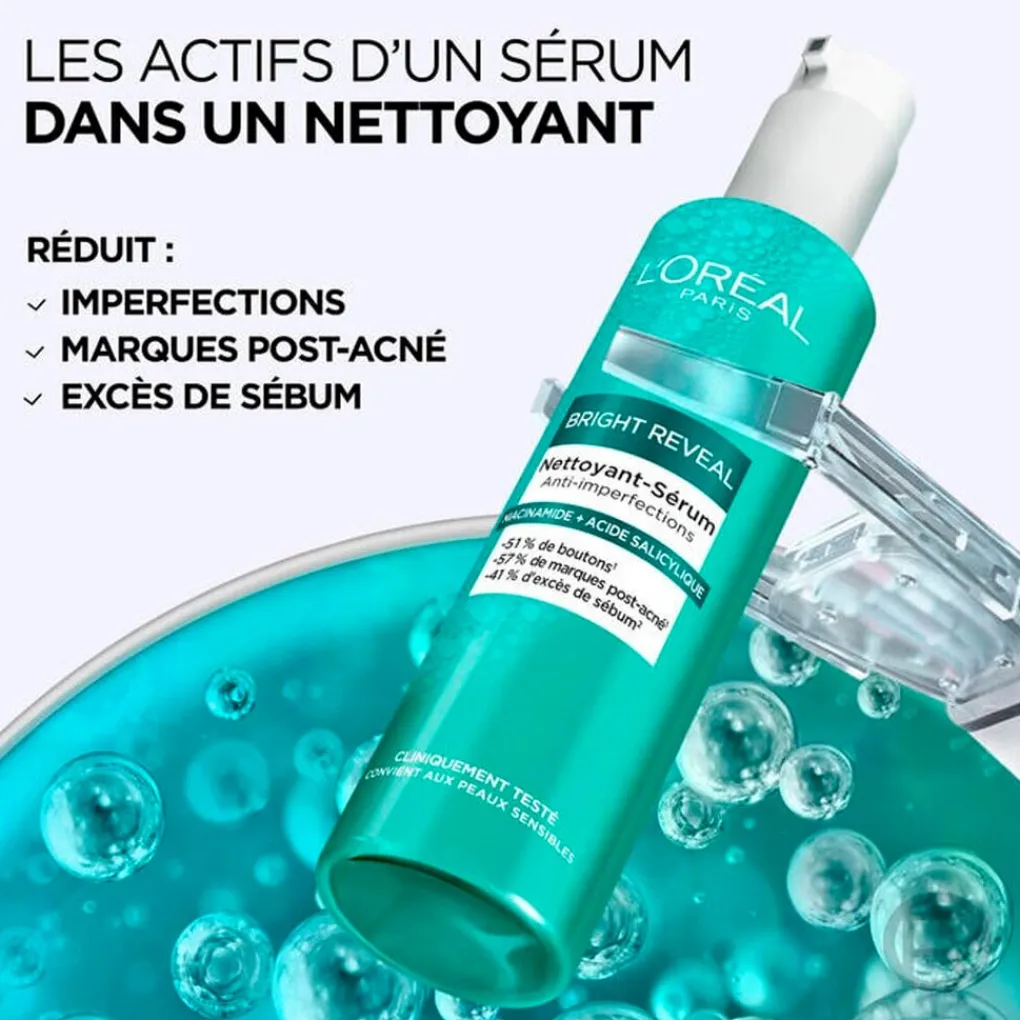 Ontdek de L’Oréal Paris Bright Reveal Gezichtsreiniger verrijkt met actieve serum-ingrediënten: de perfecte combinatie van dermatologisch bekende componenten voor een zuivere en stralende huid.