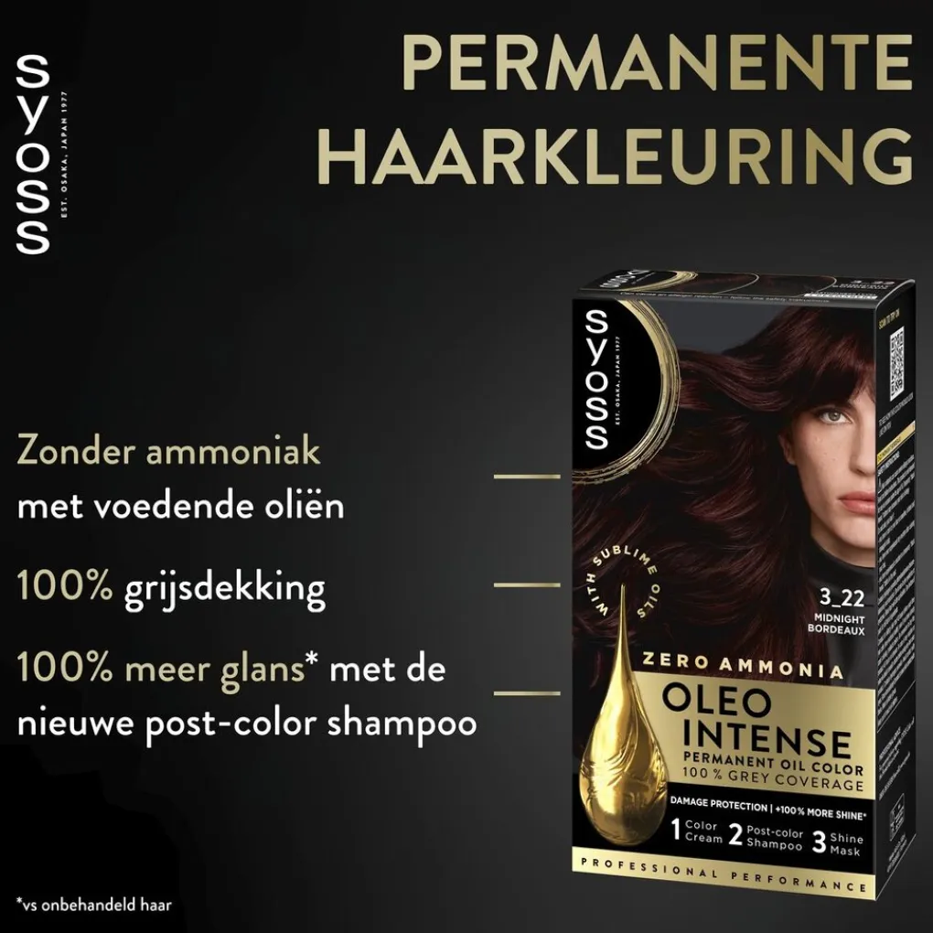 Syoss Oleo Intense 3-22 Warm Donker Bordeaux Haarkleuring bevat de Plex-in-Oil-technologie, gecombineerd met vier Japanse oliën. De permanente haarverf biedt 100% grijsdekking en luxueuze glans.