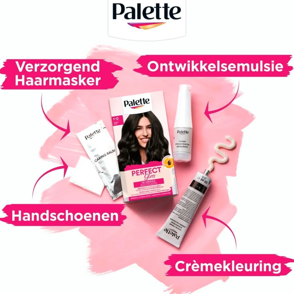 Palette Perfect Gloss 1-0 Zwart Niet-Permanente Haarverf is een ammoniakvrije uitwasbare kleuring die zorgt voor een subtiele grijsdekking die tot 28 wasbeurten houdt.