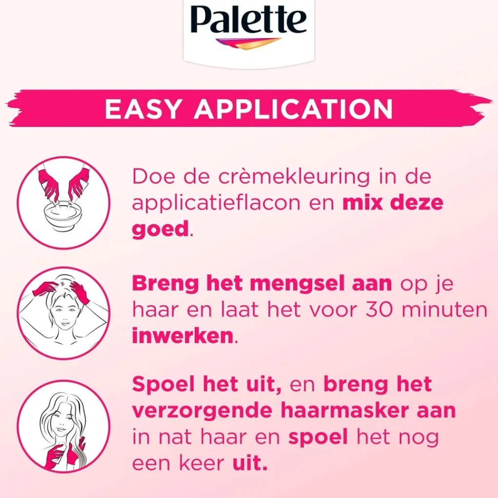 • De formule druipt niet, is gemakkelijk te mengen dankzij het lichte textuur en heeft een inwerktijd van slechts 30 minuten