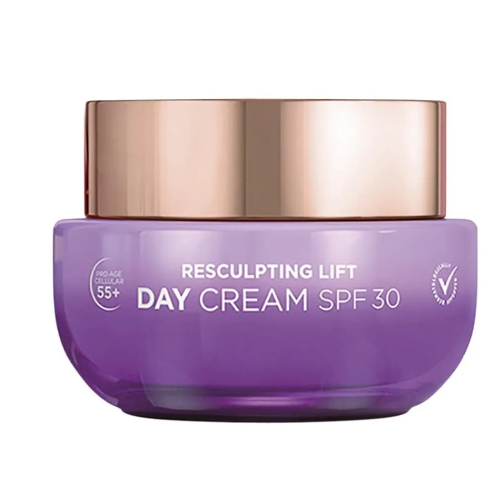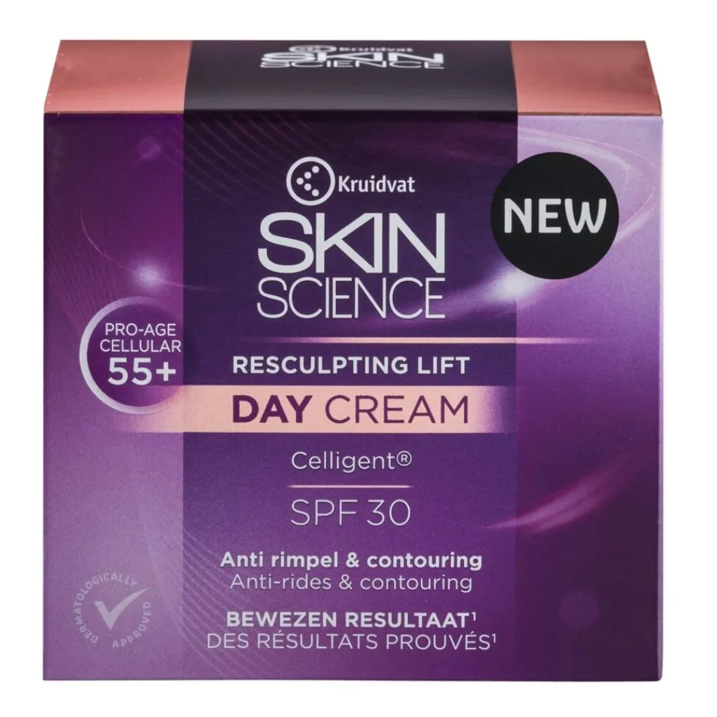 Kruidvat Skin Science Resculpting Lift 55+ Day Cream met SPF 30 lift je huid en laat haar gladder aanvoelen. De dagcrème bevat celligent, wat effectieve cel- en DNA-bescherming biedt en helpt je huid haar kracht terug te krijgen.