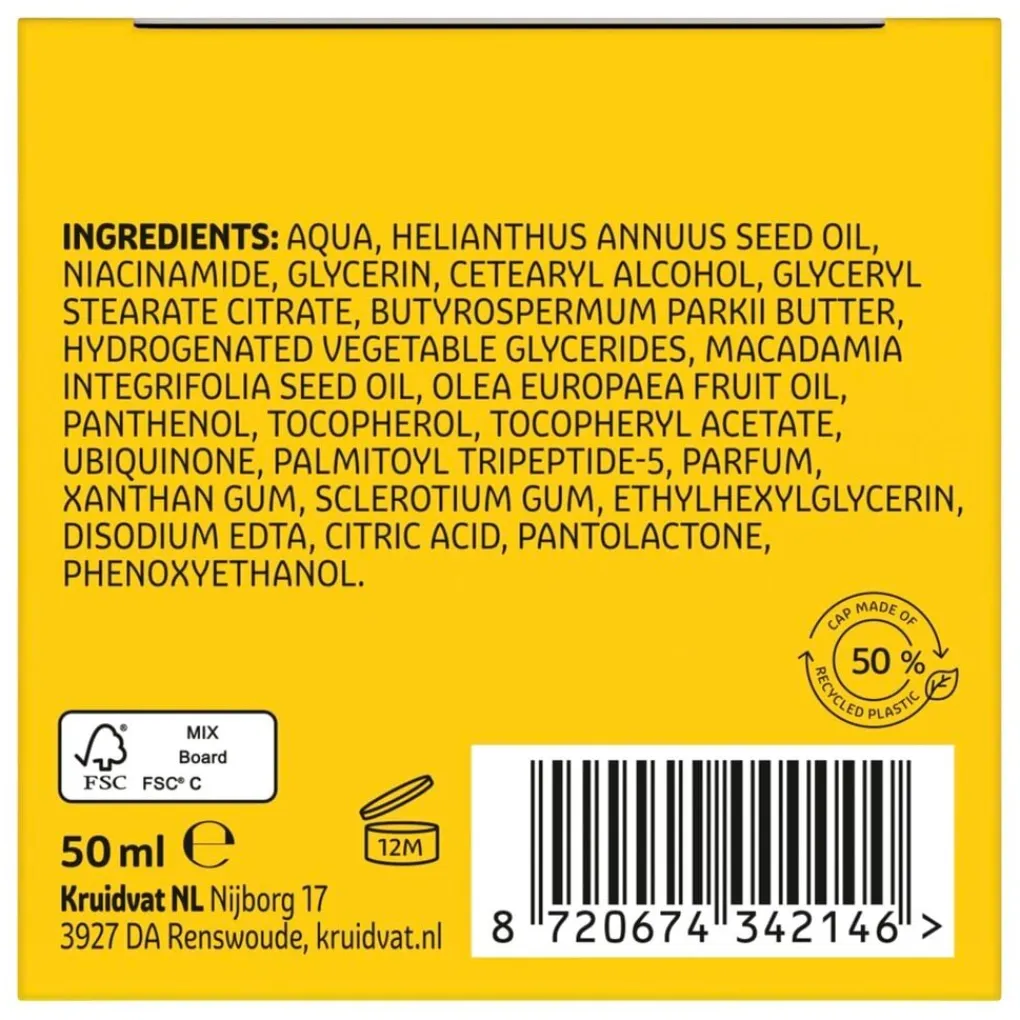 Ingredients: Aqua, Ethylhexyl Stearate, Butyrospermum Parkii Butter, Glycerin, Cetearyl Alcohol, Hydrogenated Coconut Oil, Isopropyl Isostearate, Glyceryl Stearate Citrate, Tocopheryl Acetate, Ubiquinone, Laminaria Digitata Extract, Phenoxyethanol, 1,2-Hexanediol, Caprylyl Glycol, Xanthan Gum, Parfum, Carbomer, Tetrasodium Glutamate Diacetate, Sodium Hydroxide.